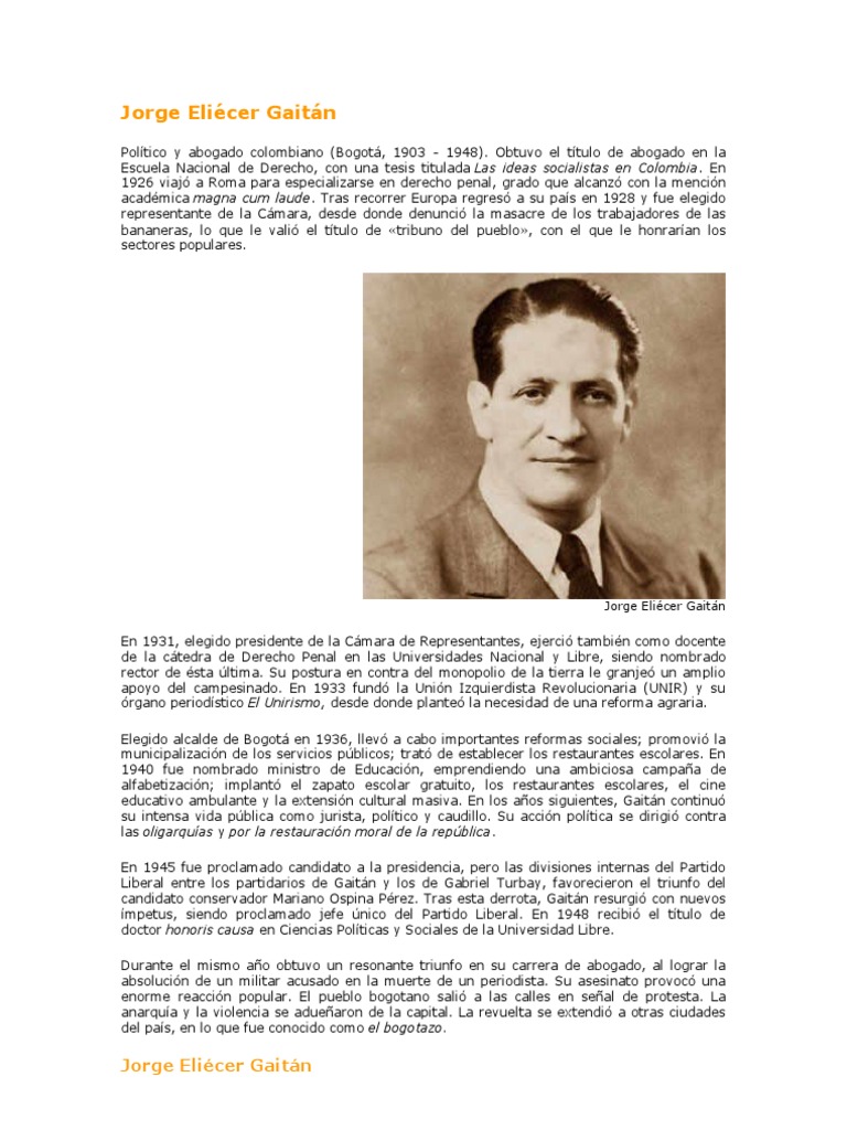 23 de enero de 19031 — ibidem,9 de abril de 1948) fue un jurista, escritor y político colombiano. Gaitán studied law at the national university of colombia, bogotá, and continued his studies in rome. Jorge eliécer gaitán nació en 1898, murió asesinado en 1948. The colombian government has made 9th april national victims day, yet victims continue to be created by the violence and the political repression. Además, logró crear su propio partido con tendencia marxista.