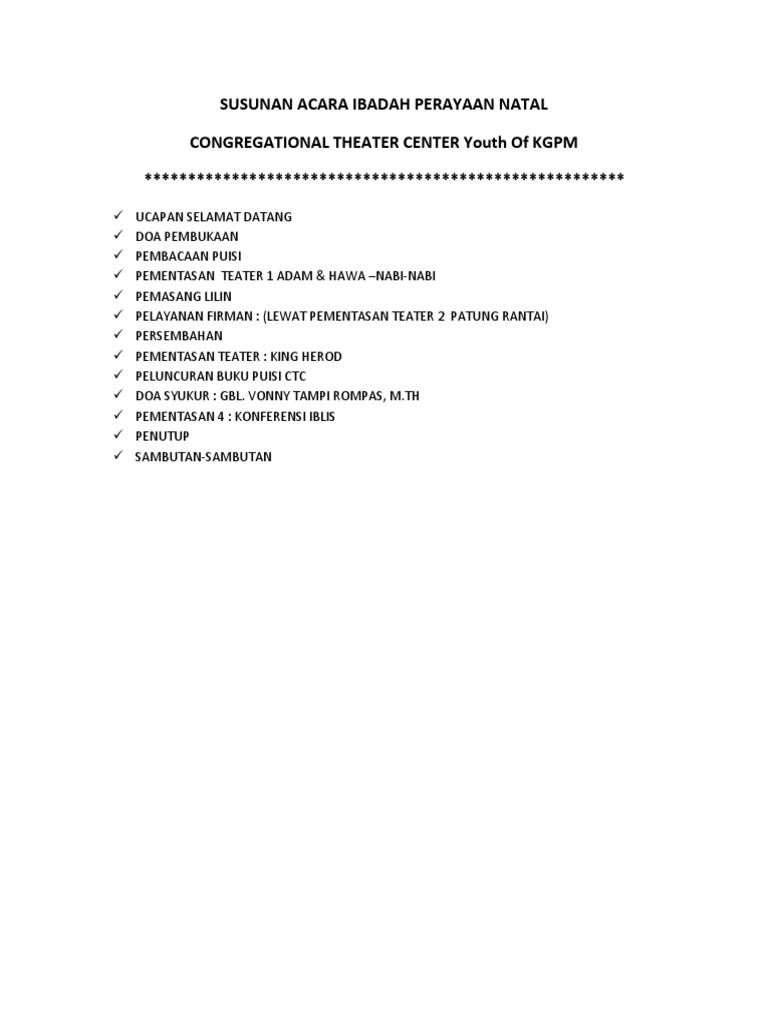 J amin p natal telah tiba, hari kelahiran juruslamat kita tuhan yesus kristus.panjatkanlah syukur kepadanya, karena kasihnya yang nyata pada kita. Teks naskah di atas bisa sobat download secara gratis yaitu dengan cara klik di pojok kanan atas makan akan tampil tanda panah. Waqinna 'adza bannar, subhana rabbika rabbil izzati amma yasifun wasalamun alal mursalin walhamdulillahirabbil alaamiin. Doa pembuka acara diatas sangat cocok bagaikan kalimat dan perkataan pembuka suatu acara pengajian di karenakan memang sunnah yang diajarkan oleh nabi. Teks pembawa acara pengajian yang sering ada di acara pengajian yang di lakukan oleh umat islam indonesia pengajian ini biasanya dilakukan di setiap acara besar islam yang setahun sekali kepada al ustad anwar zahid kamu persilahkan untuk memimpin doa sekaligus menutup acara pengajian ini.