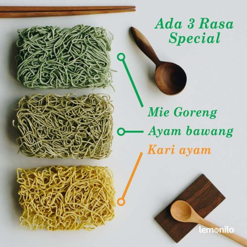Warna hijau pada mie lemonilo ini dikarenakan terbuat dari bayam.